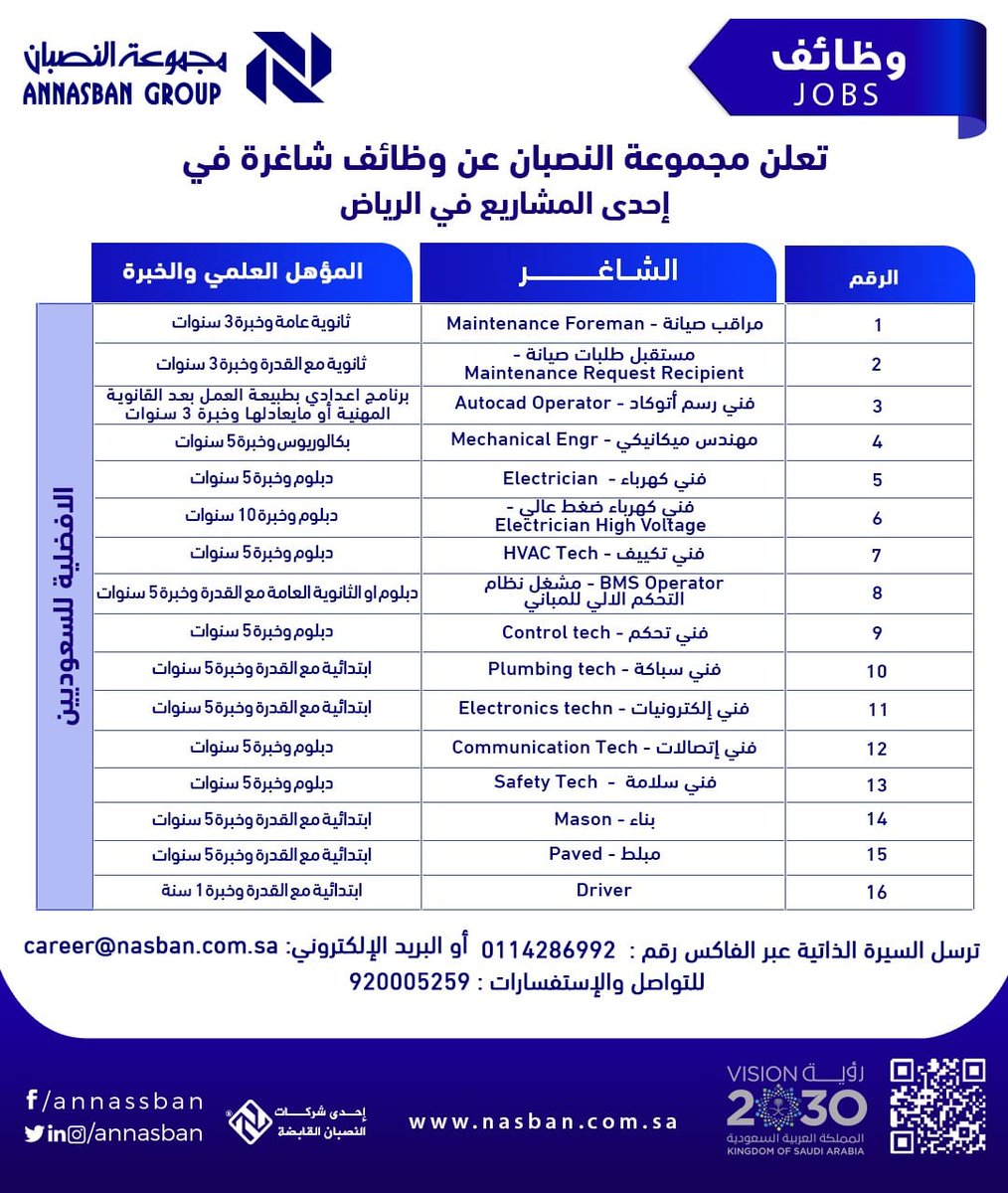 اعلنت اليوم مجموعة النصبان عن 16 شاغر وظيفي بمجالات ( هندسية وفنية وحرفية وسائقين ) للعمل بمشاريعها في مدينة الرياض وبالاسفل جميع تفاصيل الوظائف :