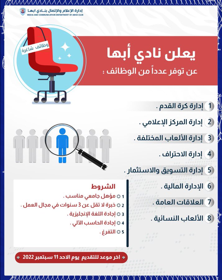 أعلن ايوم نادي أبها الرياضي فتح باب التوظيف في مختلف المجالات الوظيفية، وبالاسفل جميع تفاصيل الوظائف :