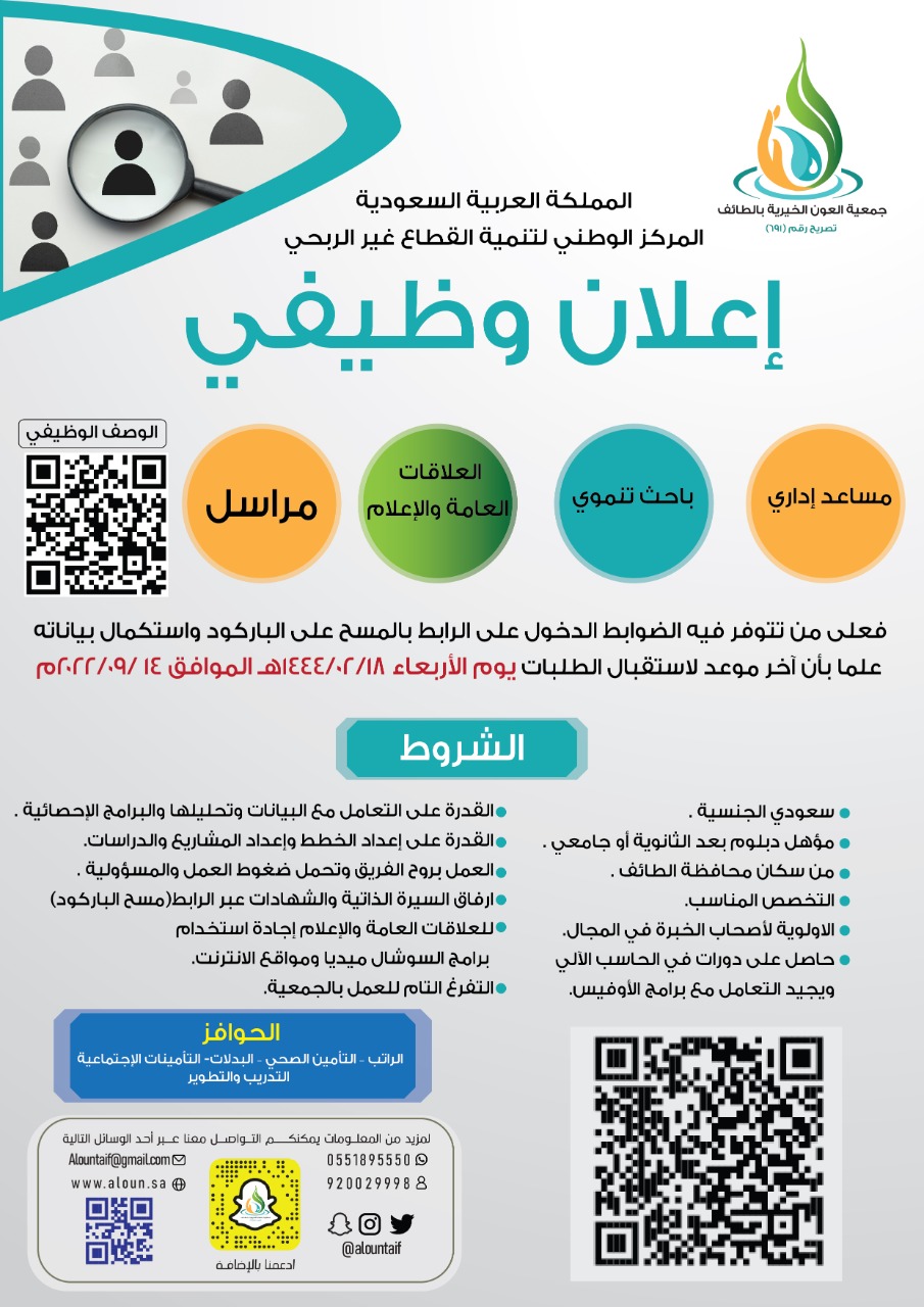 أعلنت اليوم جمعية العون الخيرية توفر وظائف إدارية واجتماعية ومراسلين بمحافظة الطائف، واشترطت الجمعية أن يكون المتقدم سعودي الجنسية، وبالاسفل جميع تفاصيل الوظائف :