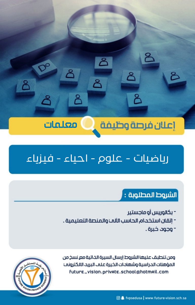 اعلنت اليوم مدارس رؤية المستقبل الأهلية عن شواغر وظيفية تعليمية في الاحساء وبالاسفل جميع تفاصيل الوظائف :