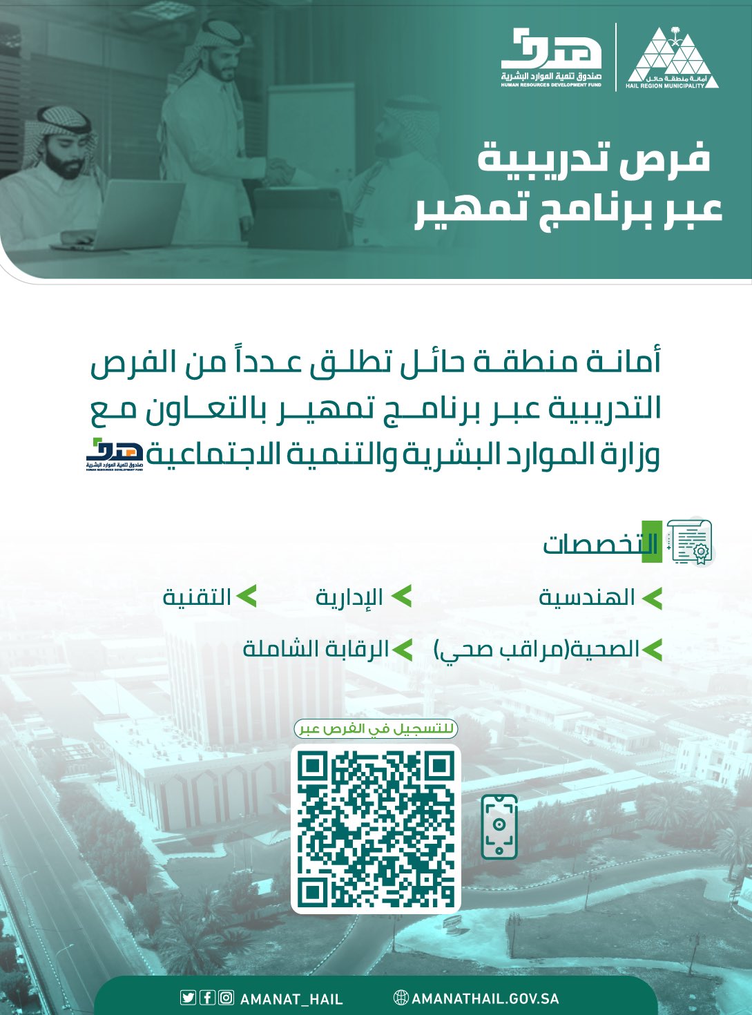 أعلنت أمانة منطقة حائل بالتعاون مع صندوق تنمية الموارد البشرية (هدف) توفر عدد من الفرص التدريبية (رجال / نساء)، للتدريب على رأس العمل عبر برنامج (تمهير)، وذلك وفقاً للتفاصيل وطريقة التقديم الموضحة أدناه.