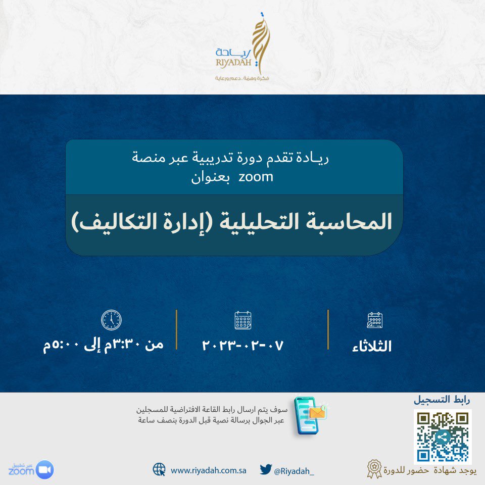 أعلن معهد ريادة الأعمال الوطني (ريادة) دعوته لروّاد ورائدات الأعمال والمهتمين بريادة الأعمال لحضور دورة تدريبية عبر منصة (Zoom)، بعنوان (المحاسبة التحليلية “إدارة التكاليف”) مع شهادة حضور للدورة، وذلك وفقاً لبقية التفاصيل الموضحة أدناه.