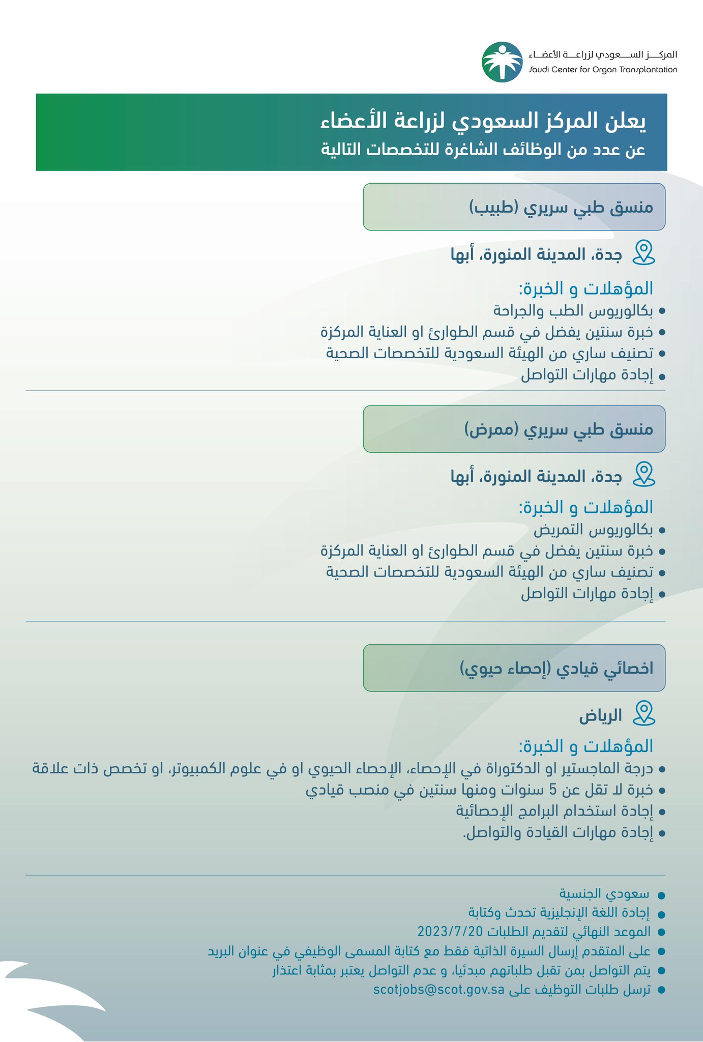 يعلن مركز السعودي لزراعة الأعضاء توفر وظائف شاغرة في التخصصات الطبية والصحية والإدارية والتقنية في (الرياض، جدة، المدينة، أبها)، وذلك وفقاً للتفاصيل وطريقة التقديم الموضحة أدناه.