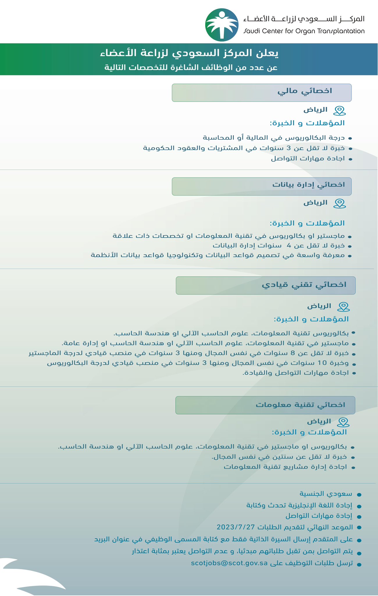 – تُرسل السيرة الذاتية إلى البريد الإلكتروني التالي (مع كتابة مسمى الوظيفة في عنوان البريد):