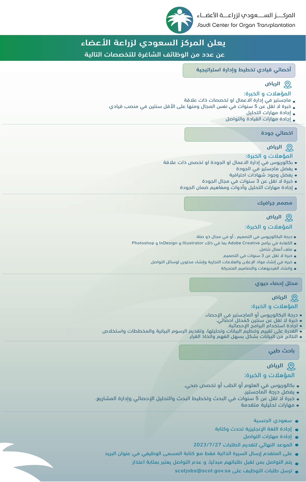 يعلن المركز السعودي لزراعة الأعضاء بمدينة الرياض توفر وظائف إدارية وتقنية وصحية، وذلك وفقاً للتفاصيل وطريقة التقديم الموضحة أدناه.