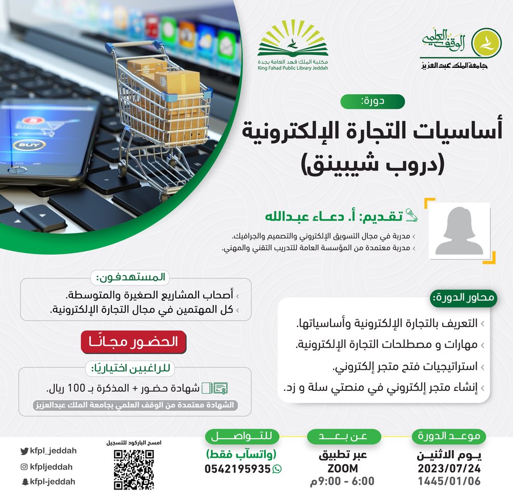 أعلنت مكتبة الملك فهد العامة بمحافظة جدة التابعة للوقف العلمي بجامعة الملك عبدالعزيز عن إقامة 8 دورات تدريبية (عن بُعد) في عدة مجالات، وسوف يكون حضور الدورات (مجاناً)، وذلك وفقاً للتفاصيل الموضحة أدناه.