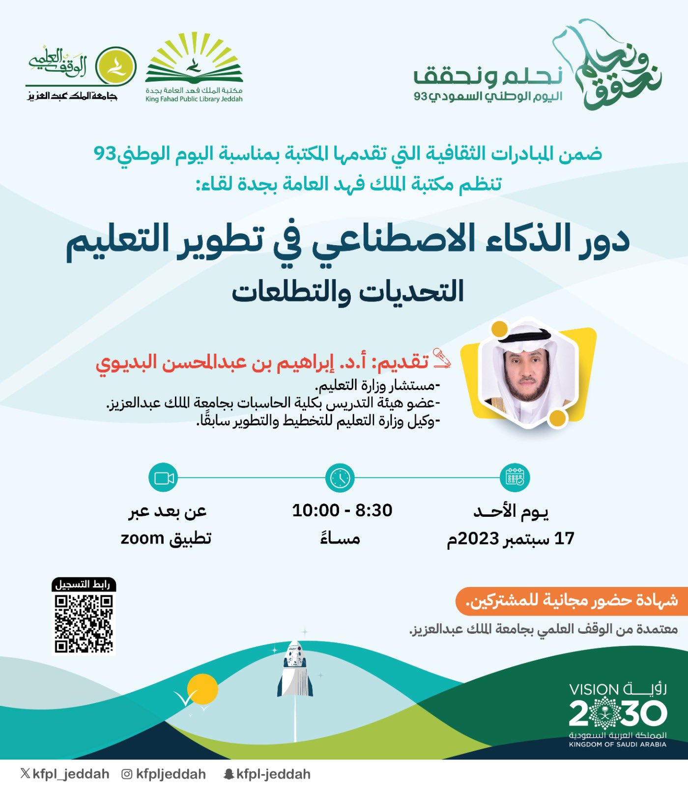 أعلنت مكتبة الملك فهد العامة بجدة بمناسبة (اليوم الوطني السعودي 93) إقامة دورة تدريبية (عن بُعد) مع شهادة حضور (مجانية)، وذلك وفقاً للتفاصيل وطريقة التقديم الموضحة أناه.