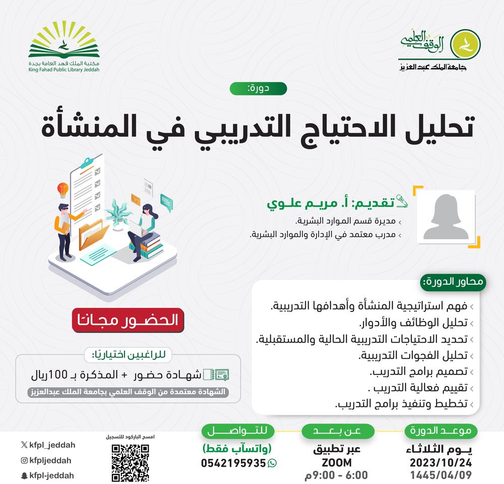 أعلنت مكتبة الملك فهد العامة بمحافظة جدة التابعة للوقف العلمي بجامعة الملك عبدالعزيز عن إقامة 10 دورات تدريبية (عن بُعد) في عدة مجالات، وسوف يكون حضور الدورات (مجاناً)، وذلك وفقاً للتفاصيل الموضحة أدناه.