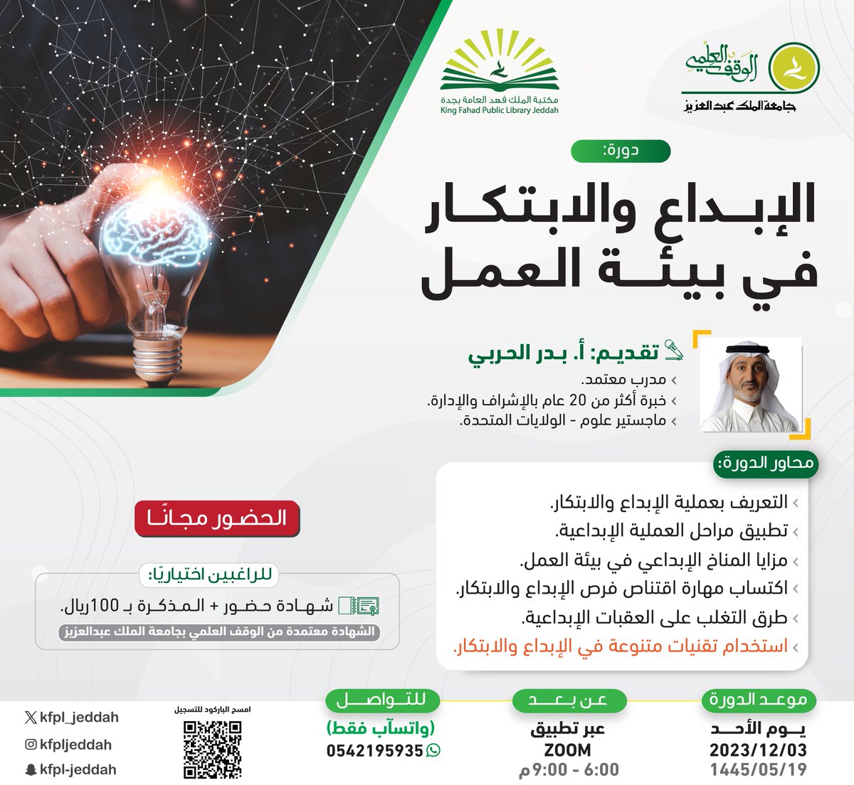 أعلنت مكتبة الملك فهد العامة بمحافظة جدة التابعة للوقف العلمي بجامعة الملك عبدالعزيز عن إقامة 10 دورات تدريبية (عن بُعد) في عدة مجالات، وسوف يكون حضور الدورات (مجاناً)، وذلك وفقاً للتفاصيل الموضحة أدناه.