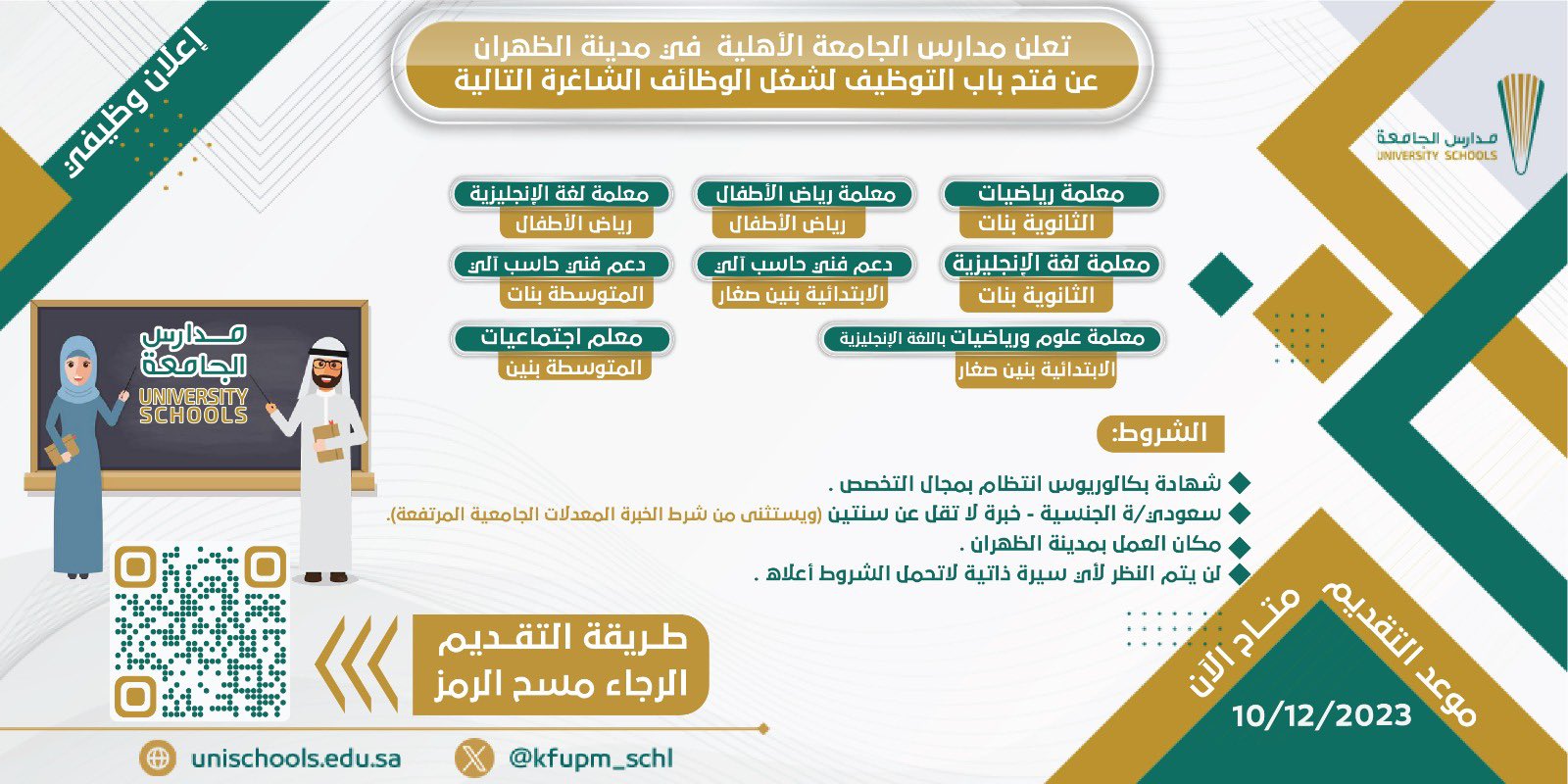 أعلنت مدارس جامعة الملك فهد للبترول والمعادن بالظهران توفر وظائف تعليمية وفنية (رجال / نساء) في مختلف التخصصات، واشترطت المدارس أن يكون المتقدم أو المتقدمة سعودي الجنسية، وذلك وفقاً للتفاصيل الموضحة أدناه.