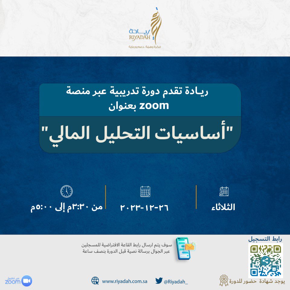 أعلن معهد ريادة الأعمال الوطني (ريادة) دعوته لروّاد ورائدات الأعمال والمهتمين بريادة الأعمال لحضور دورة تدريبية عبر منصة (Zoom)، بعنوان (أساسيات التحليل المالي) مع شهادة حضور للدورة، وذلك وفقاً لبقية التفاصيل الموضحة أدناه.