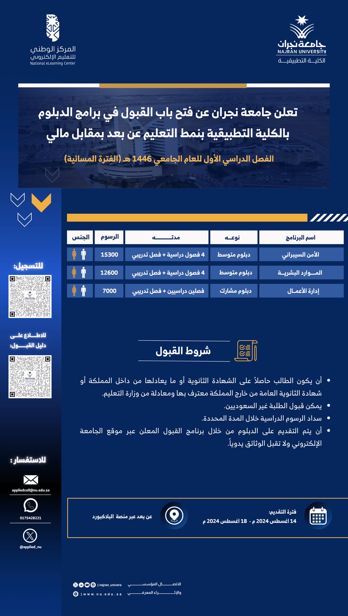 تعلن جامعة نجران مُمثلة في الكلية التطبيقية عن فتح باب القبول في برامج الدبلوم بالكلية التطبيقية بنمط التعليم عن بعد “بمقابل مالي”، و حضورياً “بمقابل مالي” للفصل الدراسي الأول للعام الجامعي 1446هـ “الفترة المسائية”، وذلك وفقًا للتفاصيل الموضحة أدناه.