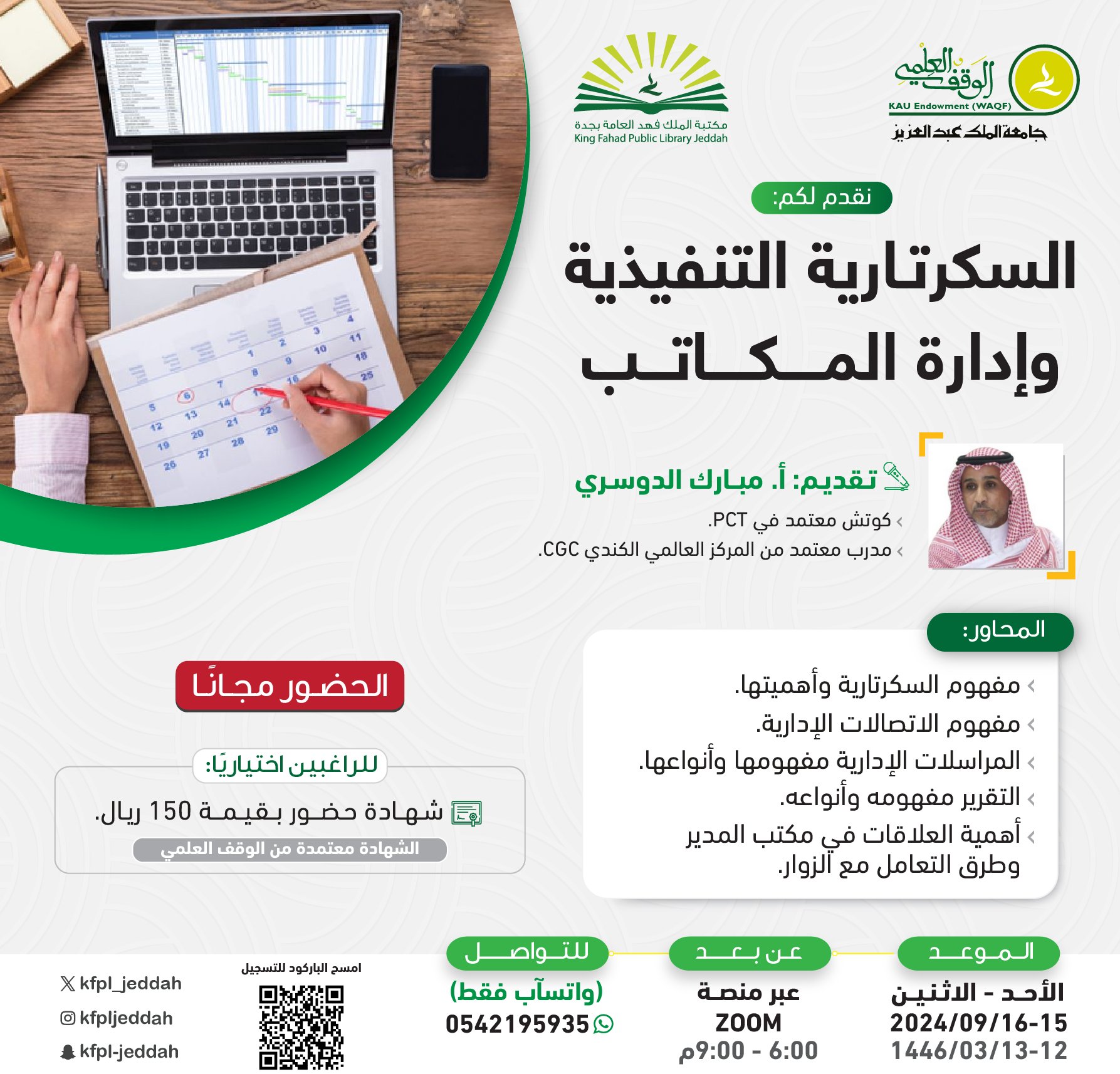 تعلن مكتبة الملك فهد العامة بمحافظة جدة التابعة للوقف العلمي بجامعة الملك عبدالعزيز عن إقامة 10 دورات تدريبية (عن بُعد) بعدة عناوين منها (إدارة المستشفيات، السكرتارية التنفيذية، صياغة العقود، نحو بيئة صفية جاذبة، التميز في إدارة العلاقات العامة)، وسوف يكون حضور الدورات فقط (مجاناً) شهادات الحضور المعتمدة من الوقف العلمي للراغبين من الوقف العلمي، وذلك وفقاً للتفاصيل الموضحة أدناه.