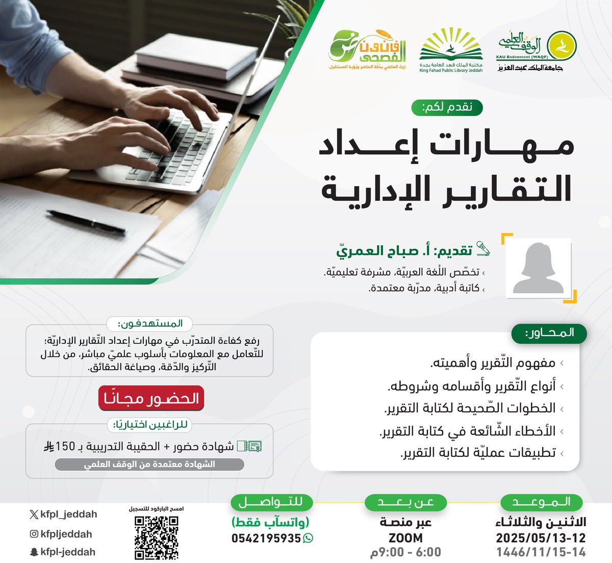 أعلنت مكتبة الملك فهد العامة بجدة التابعة للوقف العلمي بجامعة الملك عبدالعزيز عن إقامة سلسلة من الدورات التدريبية المجانية (عن بُعد)، مع شهادات حضور اختيارية (برسوم) معتمدة من الوقف العلمي، وذلك وفقاً للتفاصيل الموضحة أدناه.