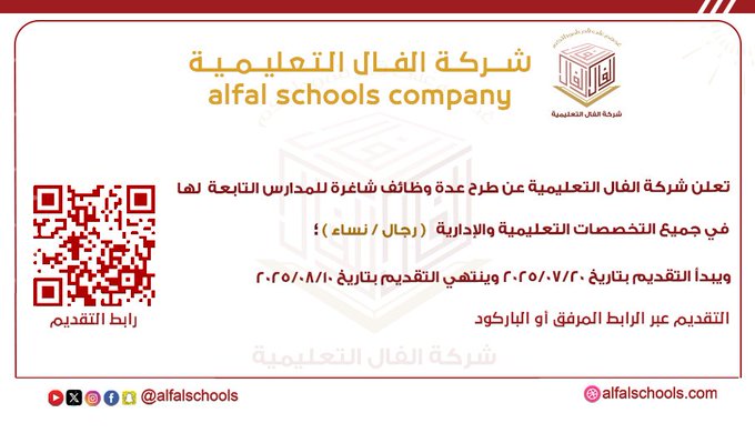 أعلنت شركة الفال التعليمية عن طرح عدة وظائف شاغرة في جميع التخصصات التعليمية والإدارية (رجال / نساء) للعمل بالمدارس التابعة لها بمدينة جدة، وذلك وفقاً للتفاصيل وطريقة التقديم الموضحة أدناه.