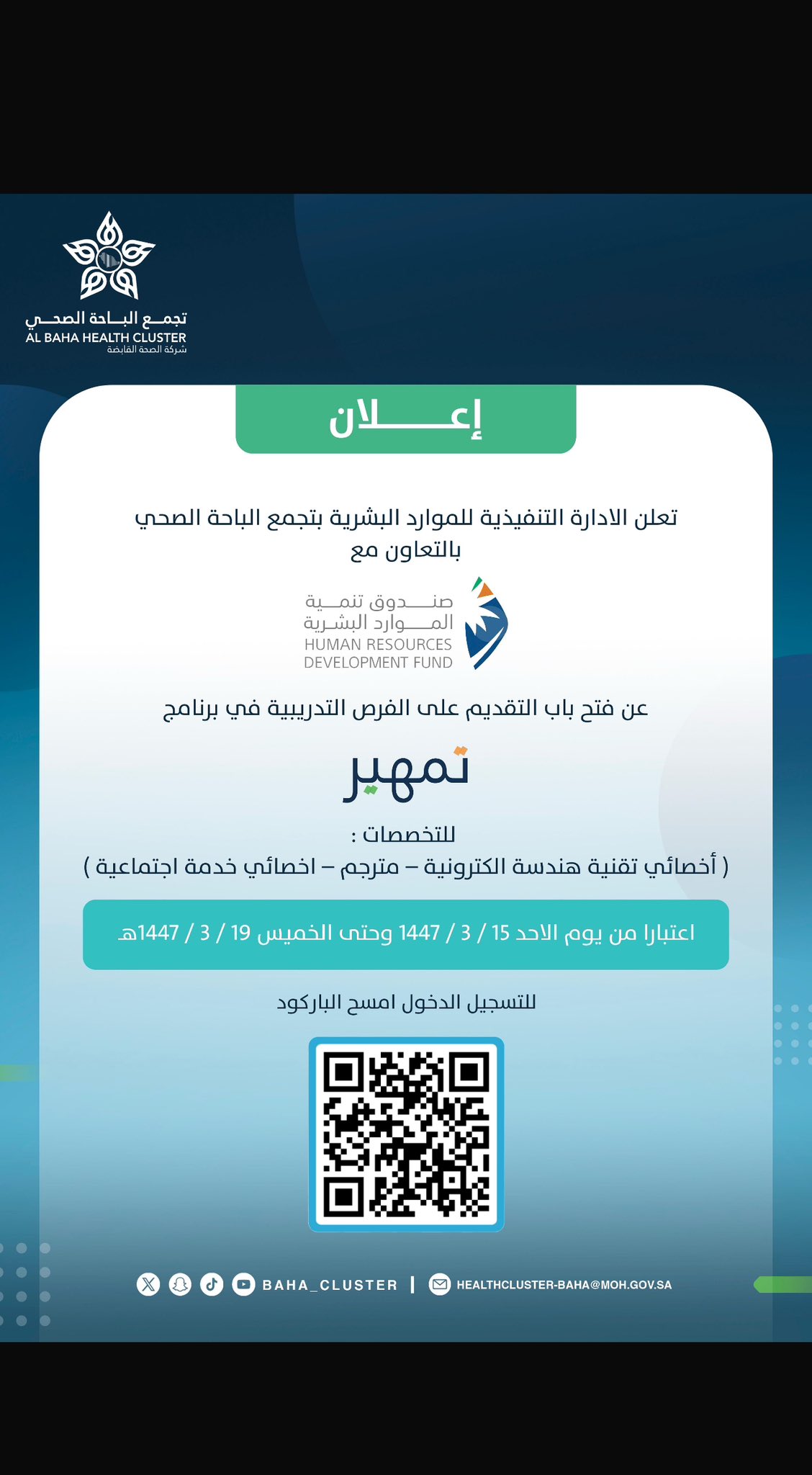 أعلن تجمع الباحة الصحي مُمثلاً في الإدارة التنفيذية للموارد البشرية، بالتعاون مع صندوق تنمية الموارد البشرية (هدف)، عن فتح باب التقديم على فرص تدريبية ضمن برنامج تمهير لعدة تخصصات، وذلك وفقاً للتفاصيل الموضحة أدناه.