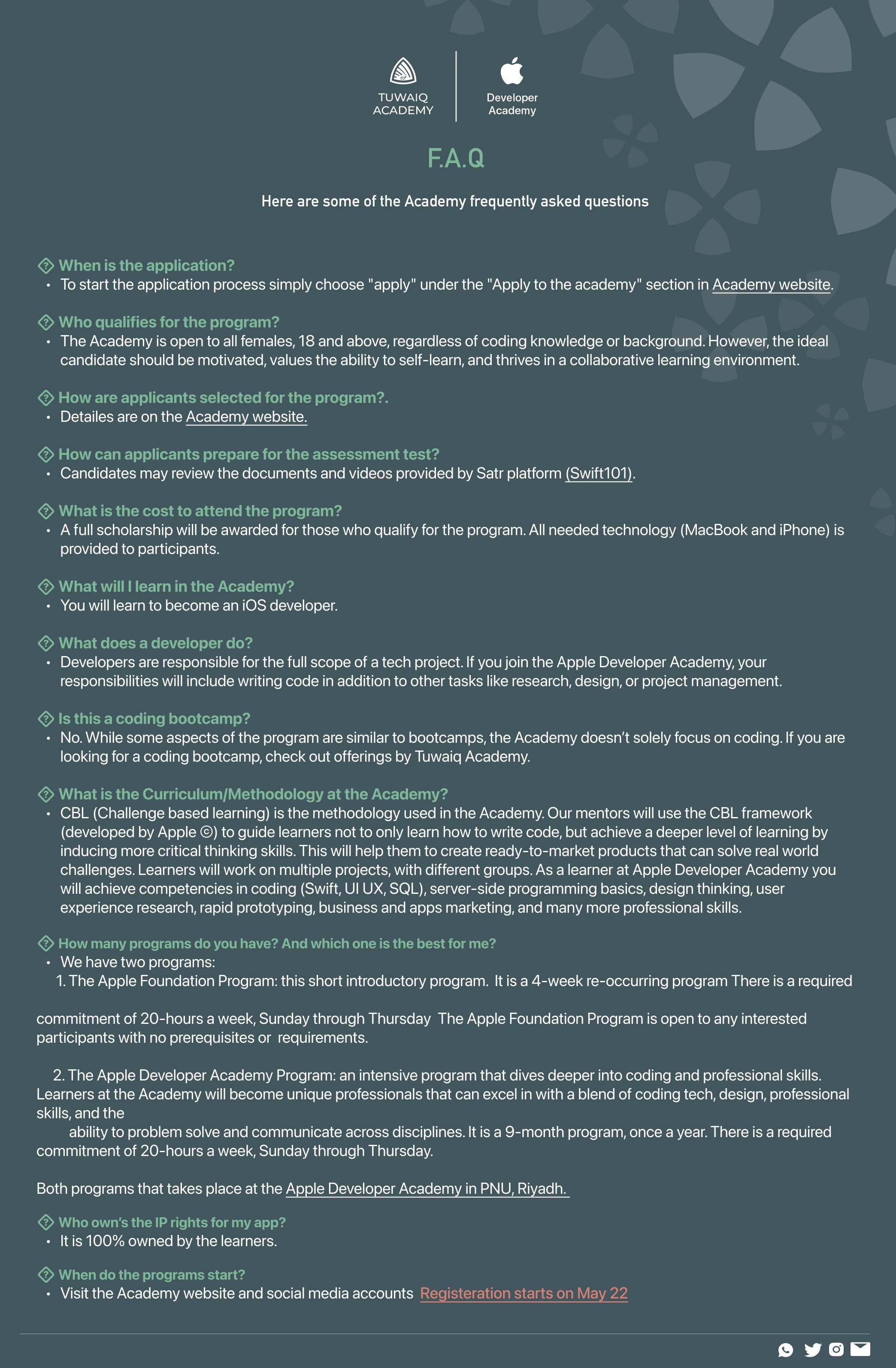 – البرنامج يقدم بمنحة دراسية كاملة للمؤهلات للانضمام للبرنامج مع توفير أحدث أجهزة أبل لكل متدربة.